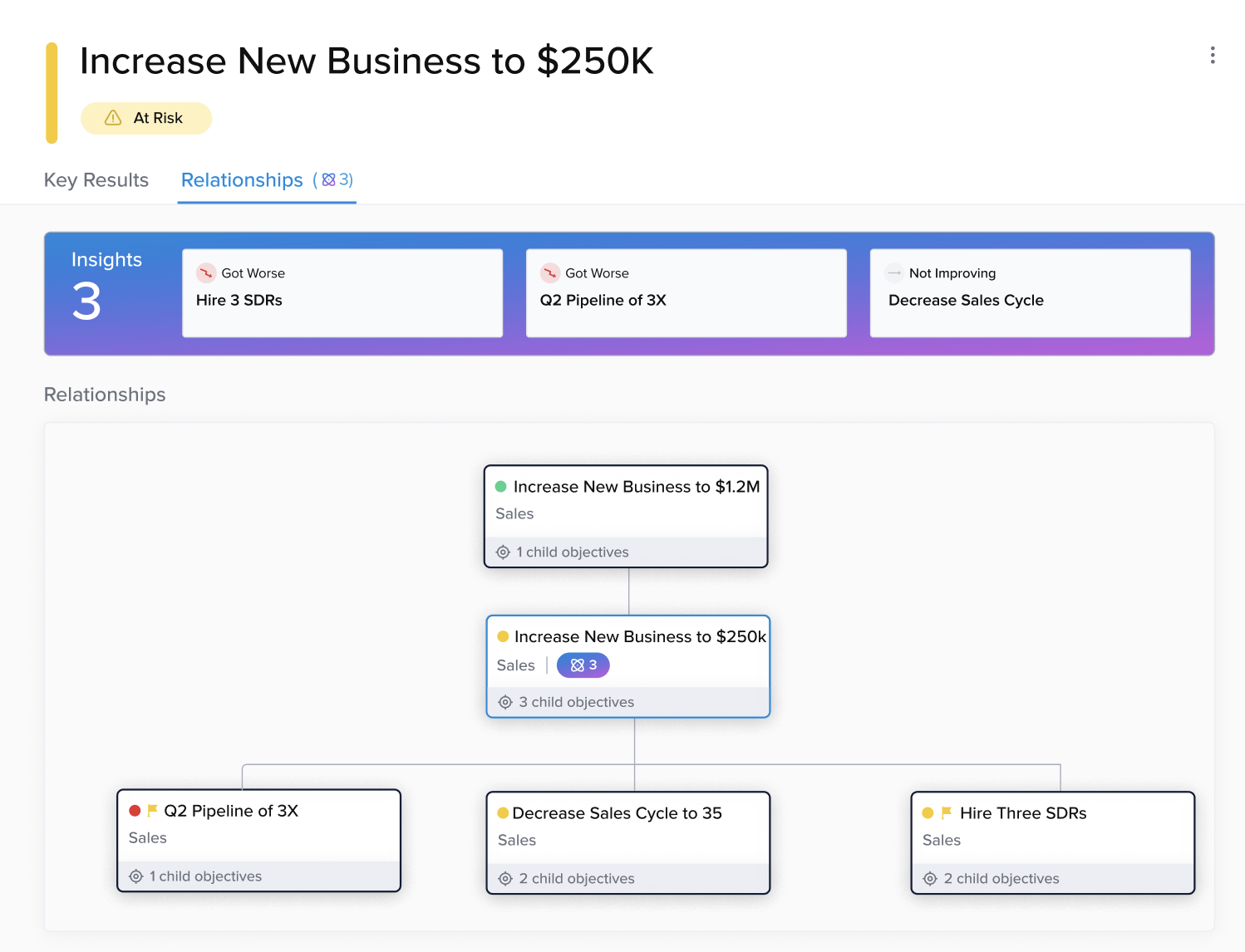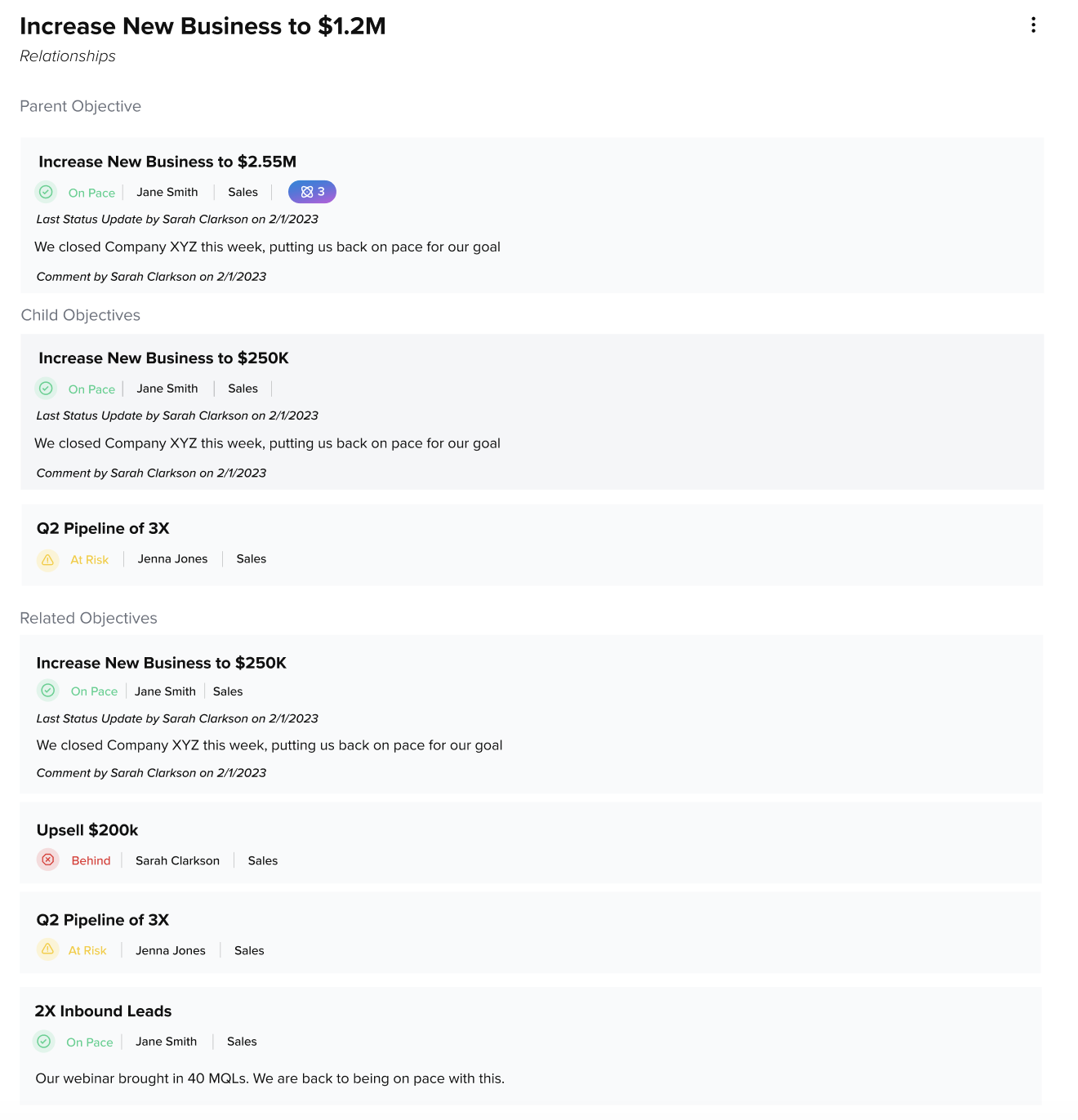 There are certain objectives, whether they are hitting revenue goals or launching a new product, that have a significant impact on the business. These objectives have numerous child objectives and related objectives, which create a ripple effect across many teams in the organization.