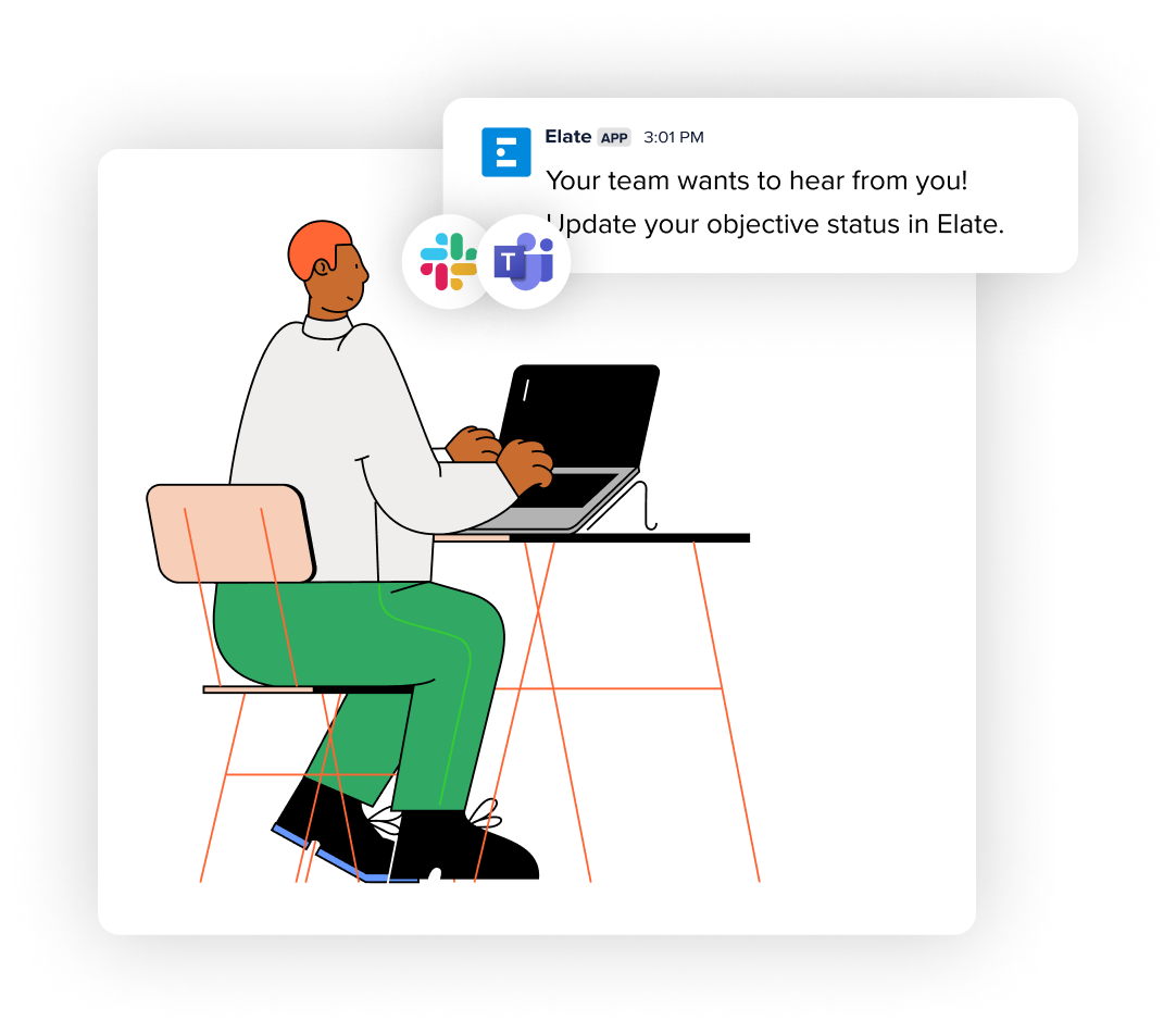 Stop asking for manual updates, and meet team members where they work. Elate’s automated Slack and Microsoft Teams notifications ensure your team actually shares their progress.