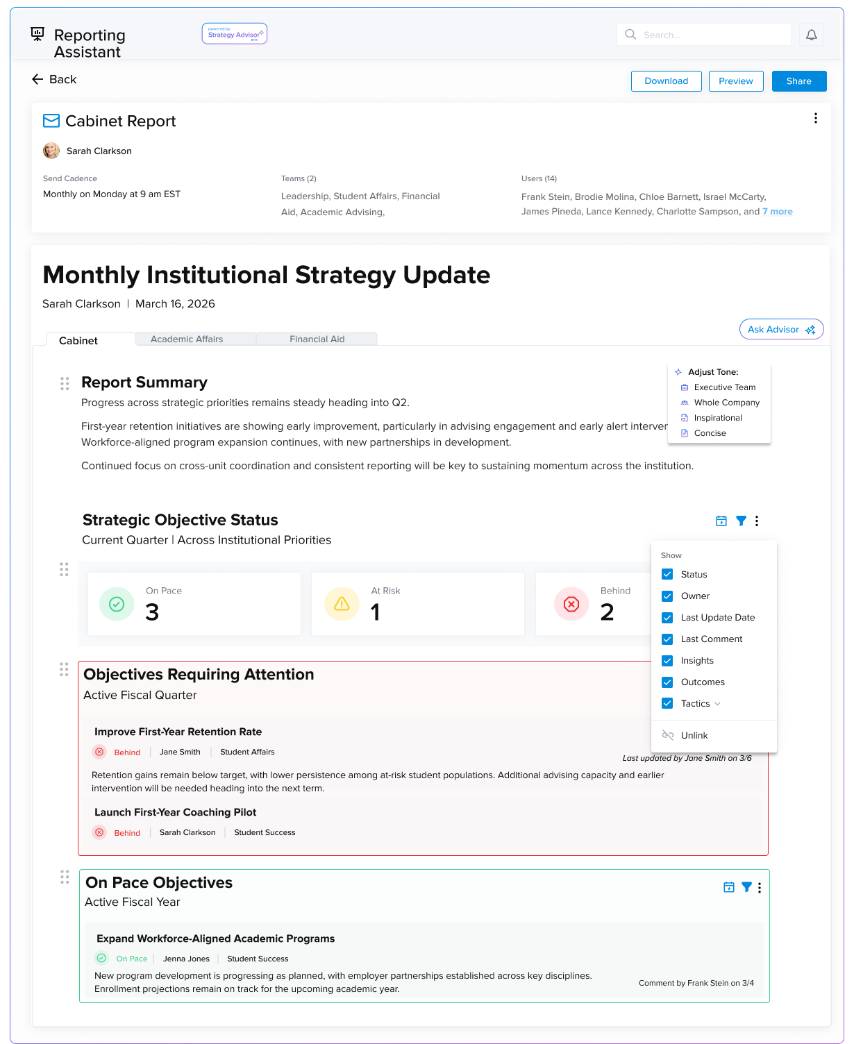 When strategy is managed through a consistent system, it becomes easier to maintain alignment, visibility, and accountability across the institution.