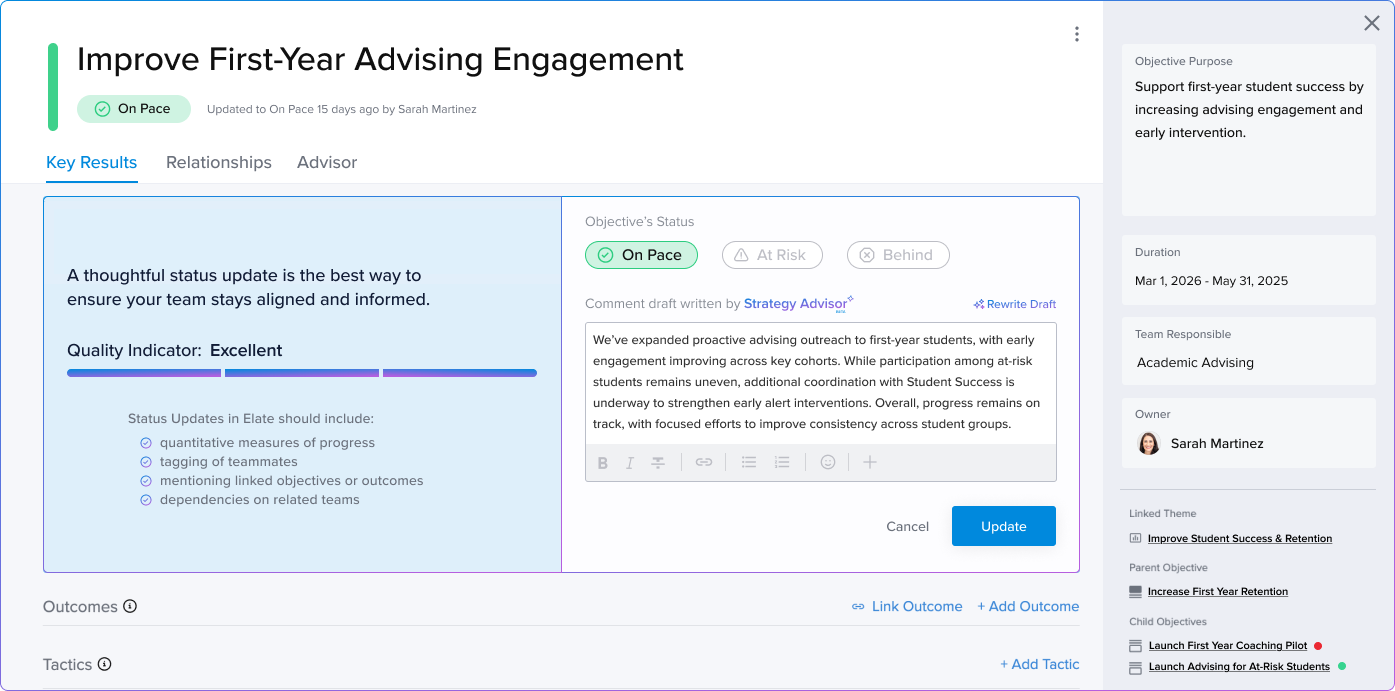It should support ongoing alignment, visibility, and decision-making across the institution. Elate helps make that possible.
