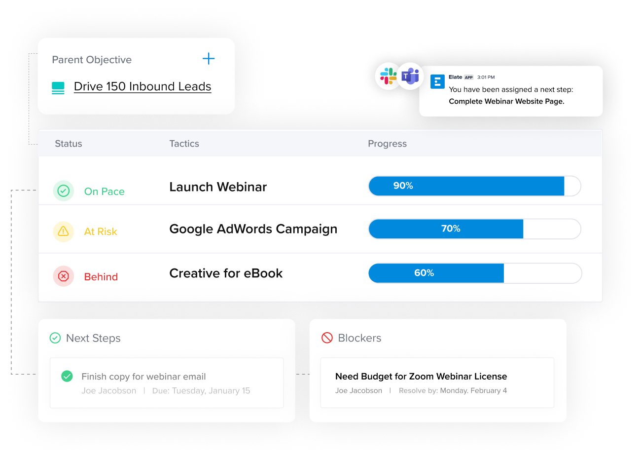 Get important updates, share ideas, and take action - all within Elate. Automated status updates and integrations to communication tools your employees use today allow you to stay in the loop on how you’re executing - and move work forward together.